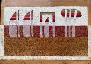 2013Oude plank met behangresten. Beschilderd zand. Figuren uitgesneden.